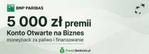 Do 5000 zł premii z Kontem Firmowym BNP Paribas - w tym do 2400 zł moneyback za paliwo i zakupy na stacjach oraz do 2600 zł za skorzystanie z finansowania. Konto i karta za 0 zł przez 3 lata.